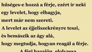 A feleség meg akarja tudni, hűséges-e hozzá a férje, ezért ír neki egy levelet, hogy elhagyja, mert már nem szereti. A levelet az éjjeliszekrényre teszi,…