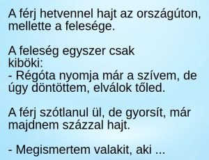 A férj hetvennel hajt az országúton, mellette a felesége. A feleség egyszer csak kiböki: – Régóta nyomja már a szívem, de úgy döntöttem, elválok tőled.…