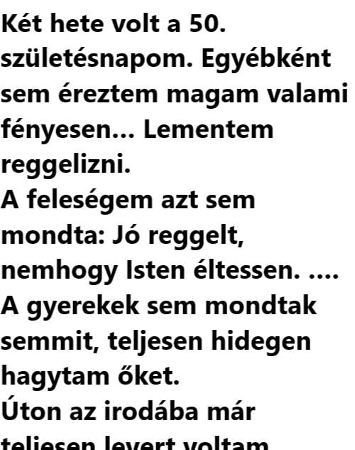 Két hete volt a 50. születésnapom. Egyébként sem éreztem magam valami fényesen… Lementem reggelizni. A feleségem azt sem mondta: Jó reggelt, nemhogy Isten éltessen. ….…